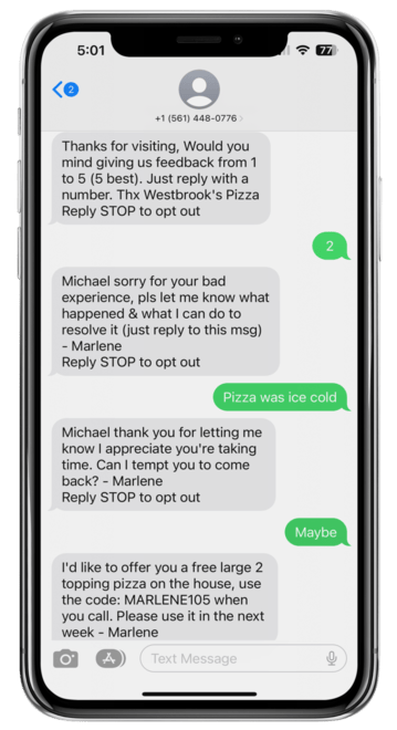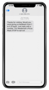 In this method, a staff member enters the customer information into your web form. This triggers an SMS text which asks the customer for feedback on a scale of 1 to 5 (5 being best).